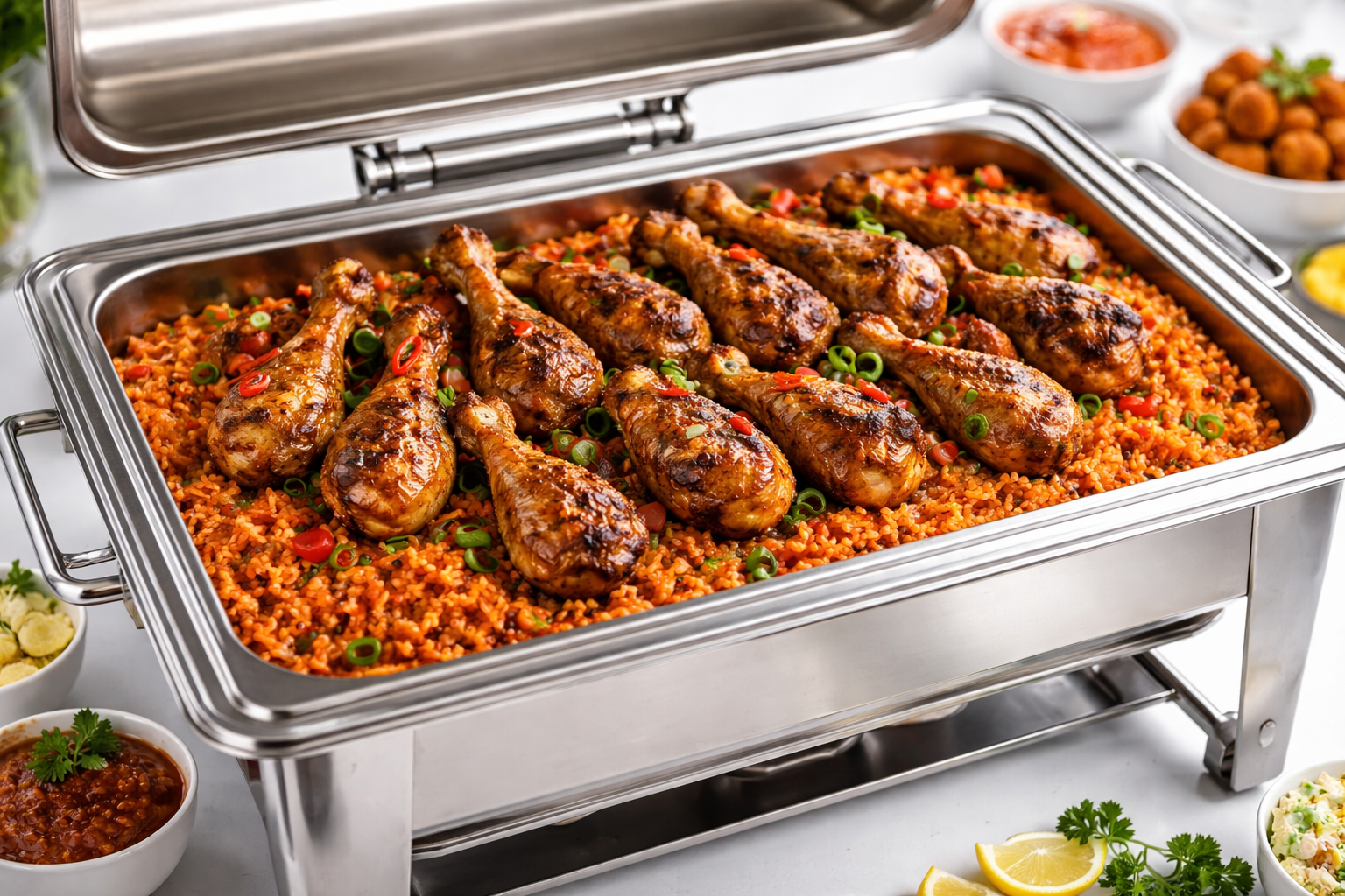 Make your event unforgettable with our rich, smoky authentic Nigerian jollof rice, perfectly paired with juicy, flame-grilled chicken drumsticks — beautifully presented in a premium 9-litre silver chafing dish, ready to serve.